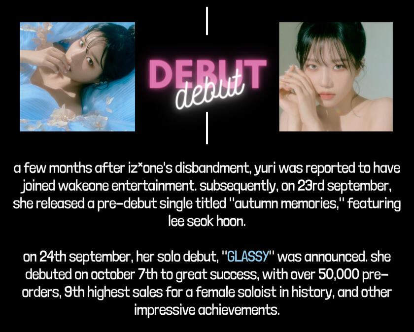 name: jo yuri (조유리)d.o.b: october 22, 2001birthplace: namgu, busanheight: 162cm (5'4")company: wakeone entertainmentinstagram: zo__glasssfan name: GLASSY